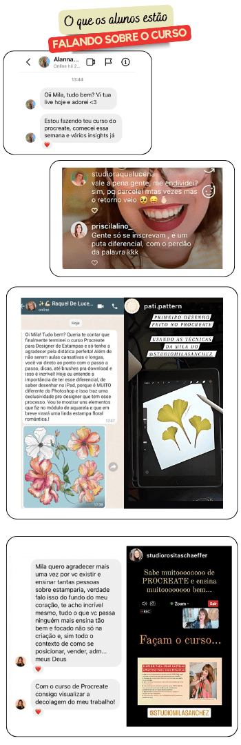 Através de conhecimento prático, e da experiência da mentora Mila Sanchez, o aluno aprenderá a criar elementos digitais através do Procreate, além de desenvolver elementos que se assemelham a técnicas manuais, criar seu próprio brush, detalhar elementos, criar e finalizar arquivos, criar estampas no Procreate e no Adobe Photoshop, técnicas para utilizar o aplicativo e participará de um desafio final do curso.