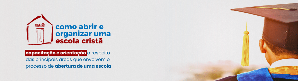 Banner superior do produto. Segue a descrição do conteúdo: O curso "Como abrir e organizar uma escola cristã" é cuidadosamente planejado para capacitar e orientar os participantes a respeito das principais áreas que envolvem o processo de abertura de uma escola. Neste curso são tratados desde os aspectos filosóficos e práticos que se identificam com a prática da educação escolar cristã.
