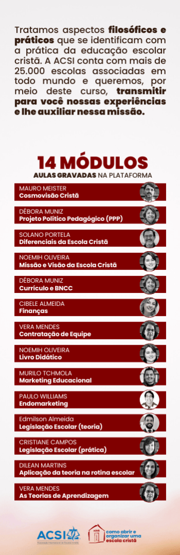 A ACSI conta com mais de 25.000 escolas associadas em todo mundo e queremos, por meio deste curso, transmitir para você nossas experiências e lhe auxiliar nessa missão. TODOS OS PALESTRANTES compartilham da visão da ACSI e possuem experiência na liderança de escolas cristãs.