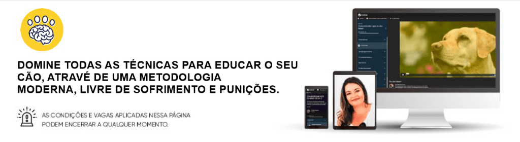 Banner superior do produto. Segue a descrição do conteúdo: Ensino você a educar o seu cachorro, de forma simples e descomplicada, através da metodologia neuro compatível, que é 100% embasada em ciência, totalmente livre do uso de punições e que se aplica a cães de qualquer tamanho, raça ou idade.