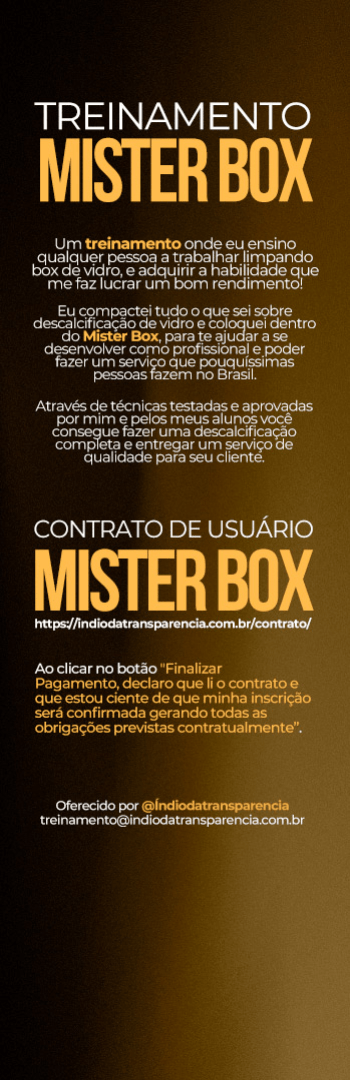 Eu compactei tudo o que sei sobre descalcificação de vidro e coloquei dentro do Mister Box, para te ajudar a se desenvolver como profissional e poder fazer um serviço que pouquíssimas pessoas fazem no Brasil.