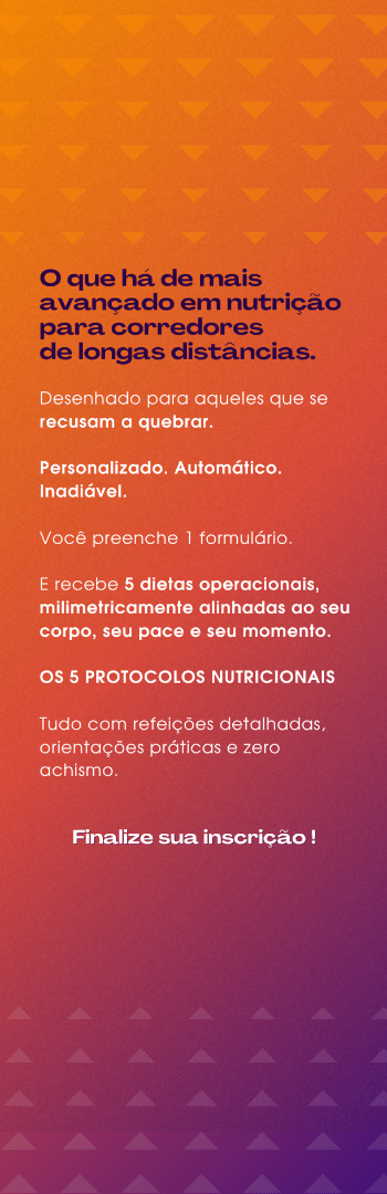 Banner lateral do produto. Segue a descrição do conteúdo: Videoaulas de estratégia alimentar e suplementação para quem corre 21k e 42k. A nutrição inteligente que irá levar a sua performance para outro patamar. Tudo que você precisa pra não quebrar, e chegar forte.