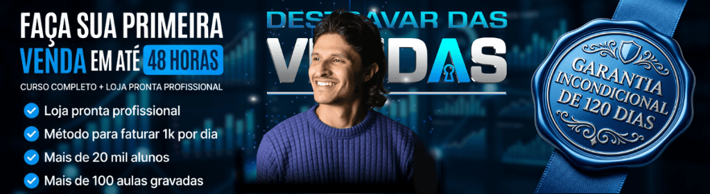 Banner lateral do produto. Segue a descrição do conteúdo: Este é um curso completo em formato de vídeo, Curso ensina tráfego pago, trafego local, e como as pessoa podem fazer as primeiras vendas na internet usando o trafego pago por isso o nome destravar das vendas