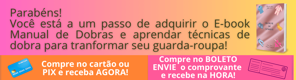 Banner superior do produto. Segue a descrição do conteúdo: E-book com as principais técnicas de dobra, para ajudar na organização das roupas, de maneira que fique prático e funcional.
