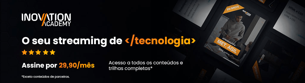 Banner superior do produto. Segue a descrição do conteúdo: Você quer se atualizar sobre as últimas tendências em tecnologia, programação, metodologia ágil e inglês para profissionais? Então você precisa conhecer o Inovation Academy+, o streaming que oferece coneútdo de qualidade e relevância para o seu desenvolvimento pessoal e profissional. Por apenas R$ 39,90 por mês, você terá acesso ilimitado a todos os cursos e trilhas completas da plataforma, que abordam temas como inteligência artificial, cibersegurança, design thinking, scrum, C#, java, inglês para negócios e muito mais.