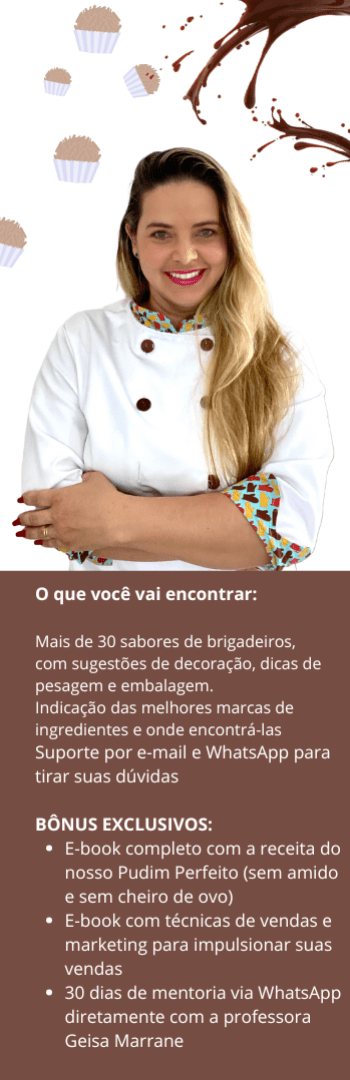 Banner lateral do produto. Segue a descrição do conteúdo: Você vai aprender a fazer brigadeiros gourmet com receitas fáceis, equilibradas e que não ficam açucaradas. Nossa técnica permite a produção em grande escala, ideal para atender eventos como casamentos, formaturas, aniversários e muito mais.