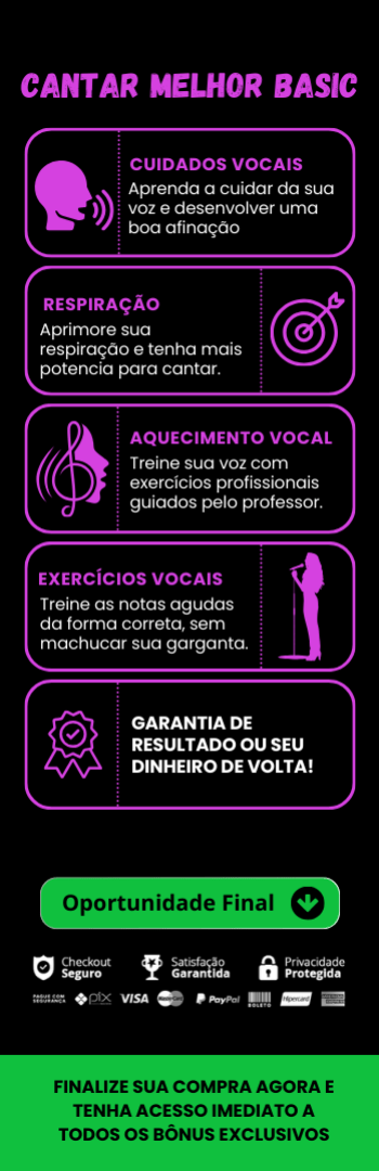 Banner lateral do produto. Segue a descrição do conteúdo: Transforme sua voz com o Cantar Melhor Premium! Aprenda técnicas essenciais de cuidados vocais, respiração, aquecimento, afinação e vibrato. Acesse bônus exclusivos de vocalizes profissionais em áudio para dominar sua performance e impressionar a todos!