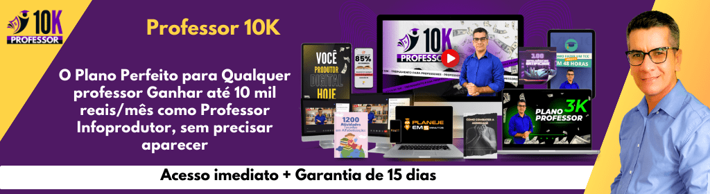 O professor 10K é um curso online que vai ajudar professor ou qualquer outra pessoal que deseja empreendedor e fazer até 10 mil reais, mensal. Nele você irá aprender a criar produtos digitais e vender todos os dias na internet.
