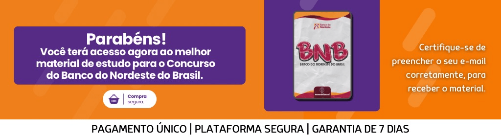 Banner superior do produto. Segue a descrição do conteúdo: Você está pronto para elevar sua preparação e alcançar a vaga dos seus sonhos no Concurso do Banco do Nordeste do Brasil? O Memoriza.aí oferece a solução perfeita para você! O que é o Memoriza.aí - BNB? Nosso material é um compêndio meticulosamente elaborado, contendo dicas estratégicas e abrangentes que englobam as principais disciplinas que serão cobradas no concurso. Vamos juntos conquistar essa oportunidade!