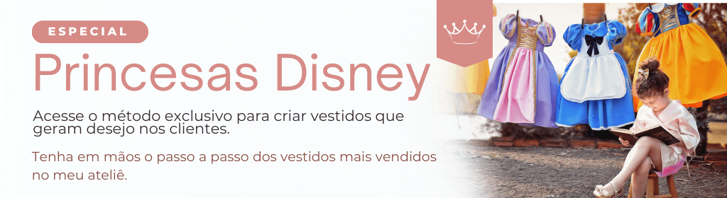 Banner superior do produto. Segue a descrição do conteúdo: Você vai conseguir confeccionar vestidos temáticos dignos de princesas, usando apenas tecidos lisos, que são encontrados em qualquer loja.