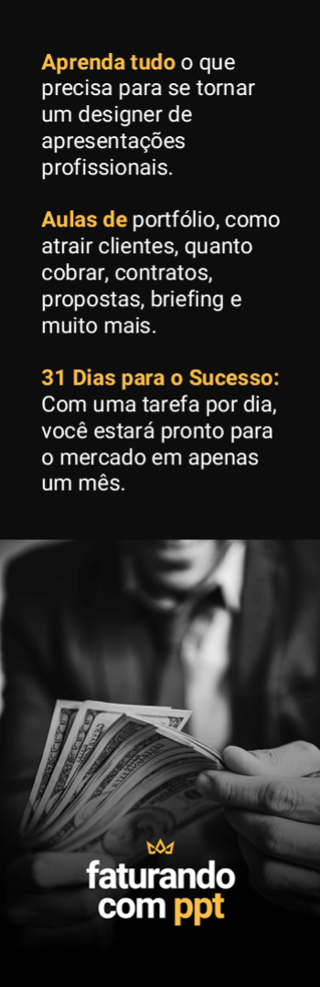 Banner lateral do produto. Segue a descrição do conteúdo: Um curso completo para quem pensa em ganhar dinheiro fazendo apresentações! Aprenda a atrair clientes, quando cobrar pelos seus projetos e o melhor: seja indicado pela Rainha do PPT!