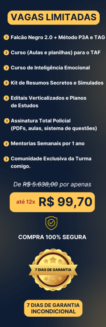 Banner lateral do produto. Segue a descrição do conteúdo: Método que te prepara em menos de 01 para passar em concursos da área policial, seja em um cargo operacional ou administrativo + Suporte e Direcionamento + Comunidade da turma e muito mais!