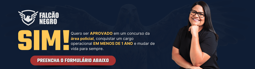 Banner superior do produto. Segue a descrição do conteúdo: Método que te prepara em menos de 01 para passar em concursos da área policial, seja em um cargo operacional ou administrativo + Suporte e Direcionamento + Comunidade da turma e muito mais!