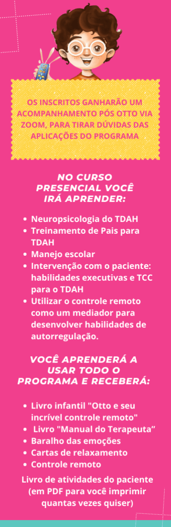 Banner lateral do produto. Segue a descrição do conteúdo: O programa Otto desenvolvido por Ariadny Abbud e Nathalia Heringer já treinou centenas de psicólogos no Brasil. O curso é orientado em práticas baseadas em evidências para o tratamento de crianças com TDAH: treinamento de pais; gerenciamento de contingências em sala de aula, manejo de contingências e treino de habilidades executivas e intervenções baseadas na terapia cognitiva comportamental.