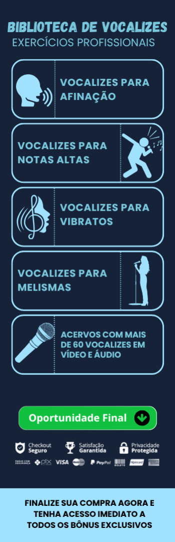Banner lateral do produto. Segue a descrição do conteúdo: A nossa Biblioteca de Exercícios Vocais é o seu recurso completo para aprimorar suas habilidades vocais e atingir todo o seu potencial como cantor e cantora. Com uma ampla variedade de exercícios cuidadosamente projetados, desde aquecimentos suaves até desafios avançados, você terá acesso ilimitado a vocalizes que ajudarão a melhorar a sua técnica vocal, aumentar o alcance, aprimorar a afinação e a projeção da sua voz.