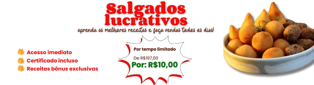 Em nosso curso completo "RENDA EXTRA COM SALGADOS", você vai aprender mais de 200 receitas de salgados e tortas que farão você lucrar todos os dias, trabalhando da cozinha de sua casa.