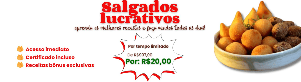 Em nosso curso completo "RENDA EXTRA COM SALGADOS", você vai aprender mais de 200 receitas de salgados e tortas que farão você lucrar todos os dias, trabalhando da cozinha de sua casa.