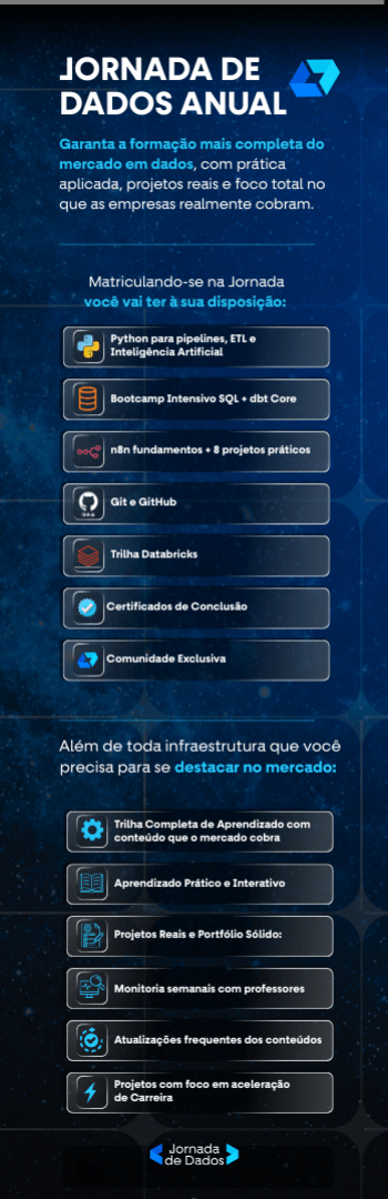 Banner lateral do produto. Segue a descrição do conteúdo: A Jornada de Dados é a formação mais completa para quem quer dominar as ferramentas e metodologias mais usadas no mercado de dados. São mais de 300 horas de conteúdo, cobrindo desde Python, SQL e a recém-lançada trilha de n8n para automações, até tecnologias avançadas como Docker, Airflow, Kafka, Terraform, AWS e Inteligência Artificial.