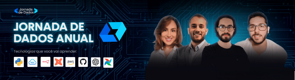 Banner superior do produto. Segue a descrição do conteúdo: A Jornada de Dados é a formação mais completa para quem quer dominar as ferramentas e metodologias mais usadas no mercado de dados. São mais de 300 horas de conteúdo, cobrindo desde Python, SQL e a recém-lançada trilha de n8n para automações, até tecnologias avançadas como Docker, Airflow, Kafka, Terraform, AWS e Inteligência Artificial.