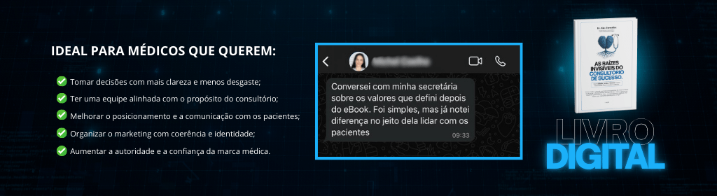 Banner superior do produto. Segue a descrição do conteúdo: Este ebook foi criado especialmente para médicos que desejam profissionalizar a gestão do consultório, sem perder a essência do cuidado humano.