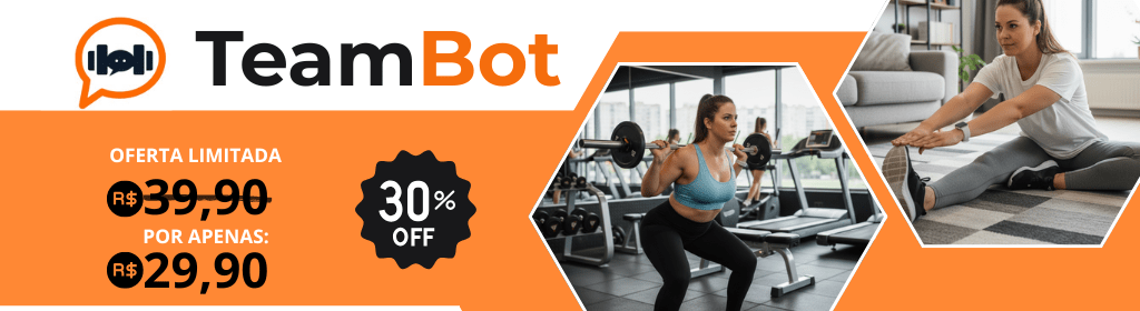 O Parceiro de Saúde: O Team Bot cuida de você além do treino. Ele envia lembretes inteligentes de hidratação ao longo do dia para garantir que seu corpo tenha energia e se recupere melhor. Além disso, ele realiza check-ins mensais para acompanhar sua evolução e ajustar o plano.