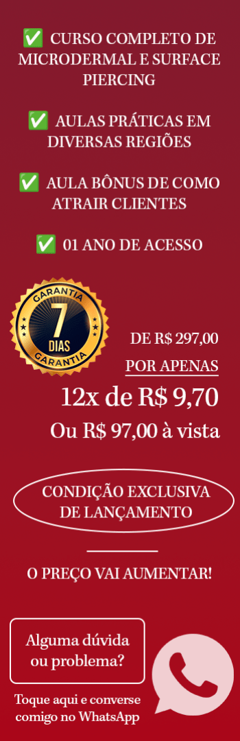 Banner lateral do produto. Segue a descrição do conteúdo: - Curso Completo de Microdermal e Surface Piercing