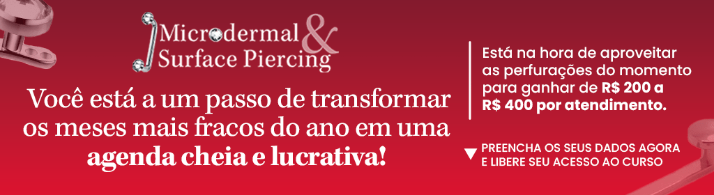 Banner superior do produto. Segue a descrição do conteúdo: - Curso Completo de Microdermal e Surface Piercing