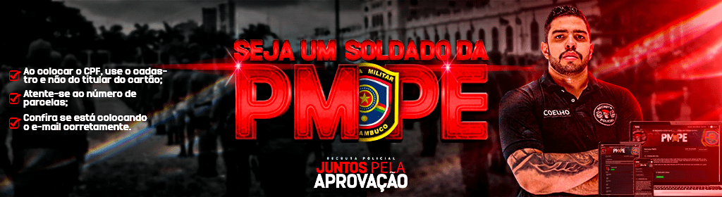 Banner superior do produto. Segue a descrição do conteúdo: O nosso produto é um curso Online focado na PMPE, onde TODOS os professores são Soldados da PMPE, ou seja, todos nós já estivemos no seu lugar e estamos onde você quer chegar. Nós sabemos como te ajudar. Confia! Ah, as aulas estão gravadas no mais alto padrão de qualidade