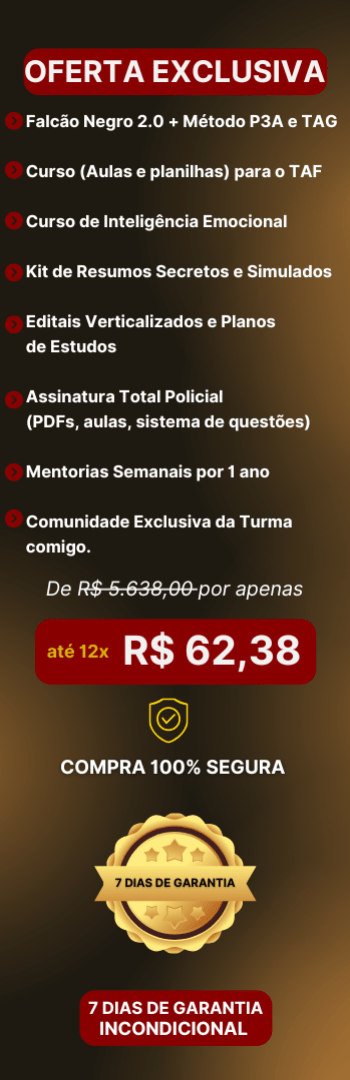 Banner lateral do produto. Segue a descrição do conteúdo: Método que te prepara em menos de 01 para passar em concursos da área policial, seja em um cargo operacional ou administrativo + Suporte e Direcionamento + Comunidade da turma e muito mais!