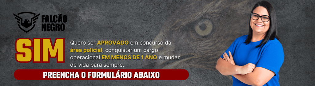 Banner superior do produto. Segue a descrição do conteúdo: Método que te prepara em menos de 01 para passar em concursos da área policial, seja em um cargo operacional ou administrativo + Suporte e Direcionamento + Comunidade da turma e muito mais!