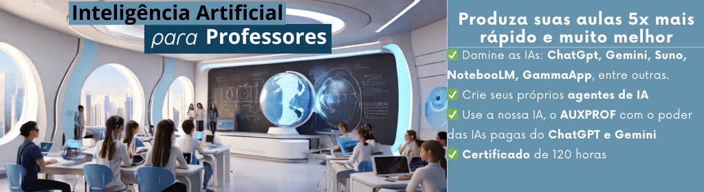 Banner superior do produto. Segue a descrição do conteúdo: Aprenda como usar a Inteligência Artificial para lhe auxiliar em todas as atividades docentes. Desde o planejamento de aulas até a preparação de materiais e montagem e planejamento das suas aulas.