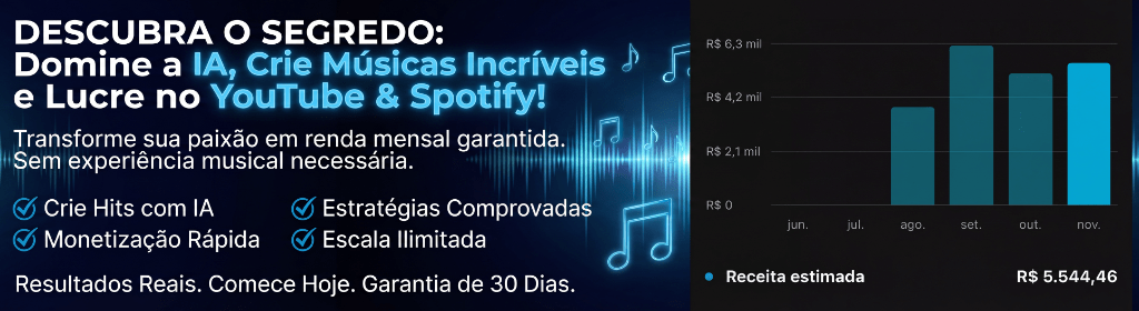 O método que usa Inteligência Artificial para produzir, do zero, músicas para artistas, YouTube e Spotify, transformando sua criatividade em uma fonte de renda diária.