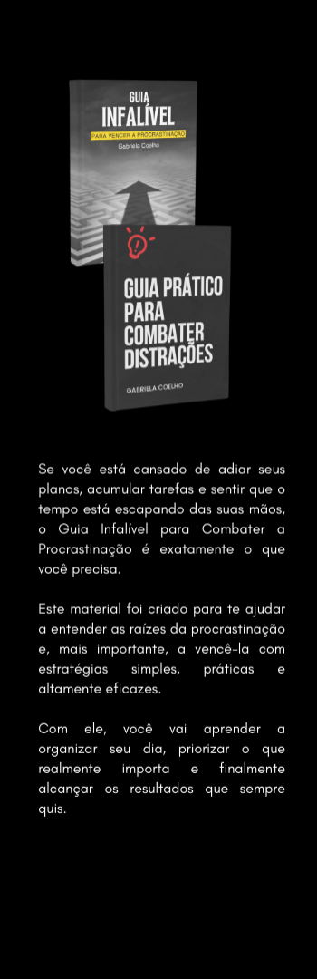 Banner lateral do produto. Segue a descrição do conteúdo: Se você está cansado de adiar seus planos, acumular tarefas e sentir que o tempo está escapando das suas mãos, o Guia Infalível para Combater a Procrastinação é exatamente o que você precisa. Este material foi criado para te ajudar a entender as raízes da procrastinação e, mais importante, a vencê-la com estratégias simples, práticas e altamente eficazes. Com ele, você vai aprender a organizar seu dia, priorizar o que realmente importa e finalmente alcançar os resultados que sempre quis.