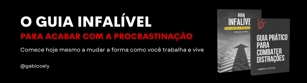 Banner superior do produto. Segue a descrição do conteúdo: Se você está cansado de adiar seus planos, acumular tarefas e sentir que o tempo está escapando das suas mãos, o Guia Infalível para Combater a Procrastinação é exatamente o que você precisa. Este material foi criado para te ajudar a entender as raízes da procrastinação e, mais importante, a vencê-la com estratégias simples, práticas e altamente eficazes. Com ele, você vai aprender a organizar seu dia, priorizar o que realmente importa e finalmente alcançar os resultados que sempre quis.