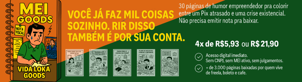 MEI GOODS é o livro de colorir de quem empreende na raça: vende, entrega, faz nota e ainda lava a louça. Pinte o caos glorioso do microempreendedor: o Pix que não cai, o cliente que some, os boletos que chegam antes da venda. Porque ser MEI é ter 7 profissões e 0 férias — mas pelo menos agora tem um livro pra rir (e colorir) da própria loucura.