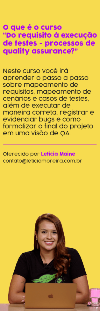 Banner lateral do produto. Segue a descrição do conteúdo: Neste curso você irá aprender o passo a passo sobre mapeamento de requisitos, mapeamento de cenários e casos de testes, além de executar de maneira correta, registrar e evidenciar bugs e como formalizar o final do projeto em uma visão de QA.