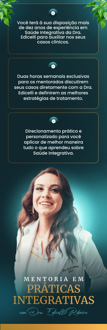 Banner superior do produto. Segue a descrição do conteúdo: Tansforme sua prática médica com uma abordagem integrativa e holística! Nesta mentoria exclusiva, a Dra. Edicelli Ribeiro, especialista em Medicina Integrativa, compartilha seu conhecimento e experiência para ajudá-lo a aprimorar seu atendimento, promover o bem-estar dos seus pacientes e se destacar na área da saúde.