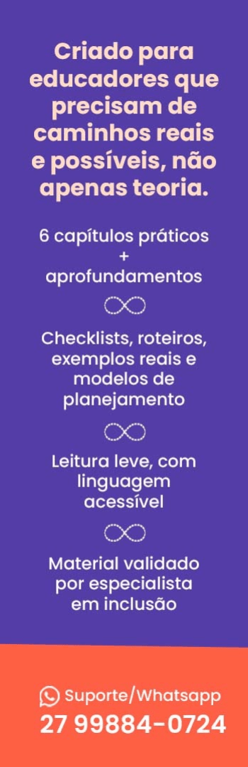 Banner lateral do produto. Segue a descrição do conteúdo: Um guia prático, direto e transformador para educadores que desejam tornar suas salas de aula mais inclusivas, mesmo sem laudo, diagnóstico ou recursos ideais.