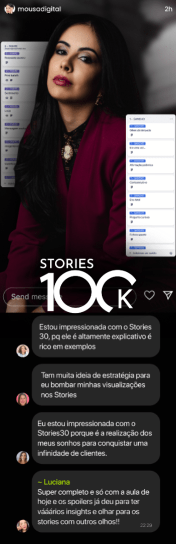 Banner lateral do produto. Segue a descrição do conteúdo: Stories100k: Imagine ter 100.000 combinaçoes de stories para os clientes e arrebente de vender nos stories, com essas 30 sequências validadas para você aplicar em apenas 10 minutos por dia.