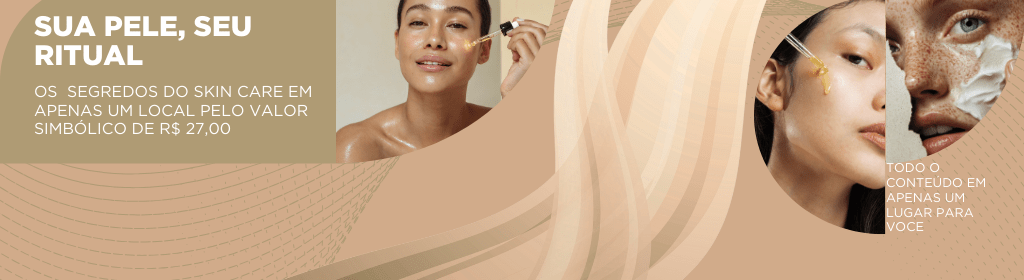 Banner superior do produto. Segue a descrição do conteúdo: O Pacote Completo Skincare reúne os 3 melhores guias para transformar sua rotina: o Sua Pele, Seu Ritual, o Receitas para Melhorar a Pele e o DermaCare Avançado. Um combo exclusivo que une rotina prática, nutrição interna e cuidados avançados para você conquistar uma pele saudável, bonita e radiante todos os dias.
