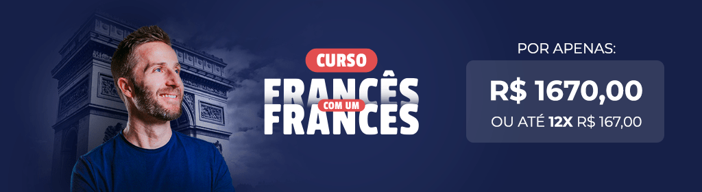 Banner superior do produto. Segue a descrição do conteúdo: O Curso Francês Com Um Francês é um programa online de francês com 9 meses de duração e 36 módulos no total para te levar a um comunicação natural 100% em francês, dominando de fato o idioma.