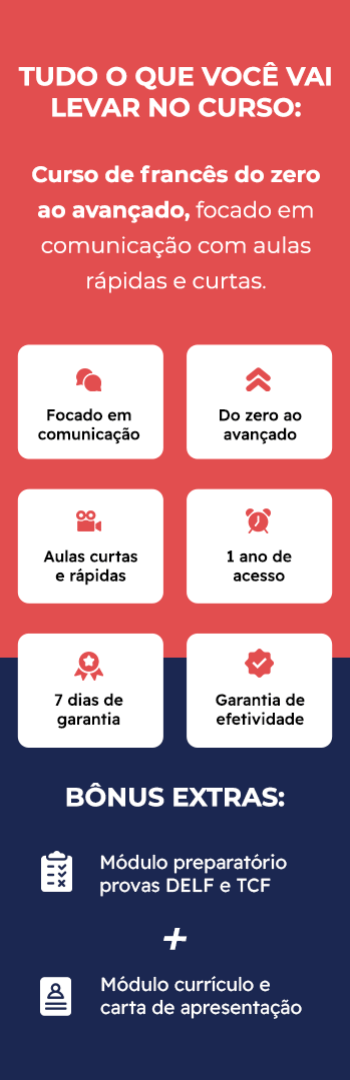 Banner lateral do produto. Segue a descrição do conteúdo: O Curso Francês Com Um Francês é um programa online de francês com 9 meses de duração e 36 módulos no total para te levar a um comunicação natural 100% em francês, dominando de fato o idioma.