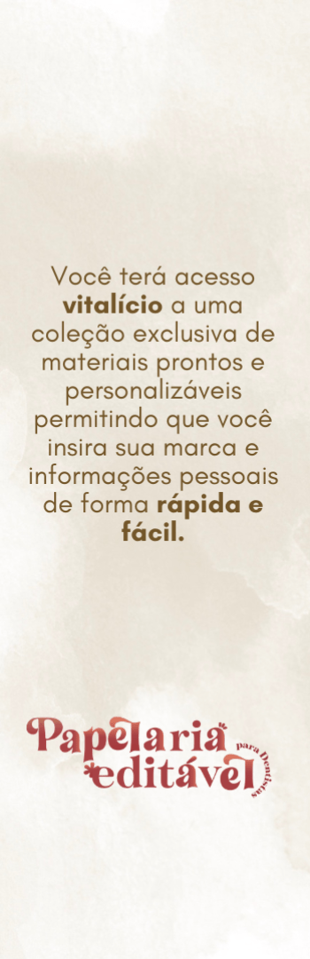 Você pode usar todas as informações que eu já disponibilizo e acrescentar o que quiser! Poderá colocar seu logo/mascotes, suas cores. Torne-se uma dentista de marca reconhecida!