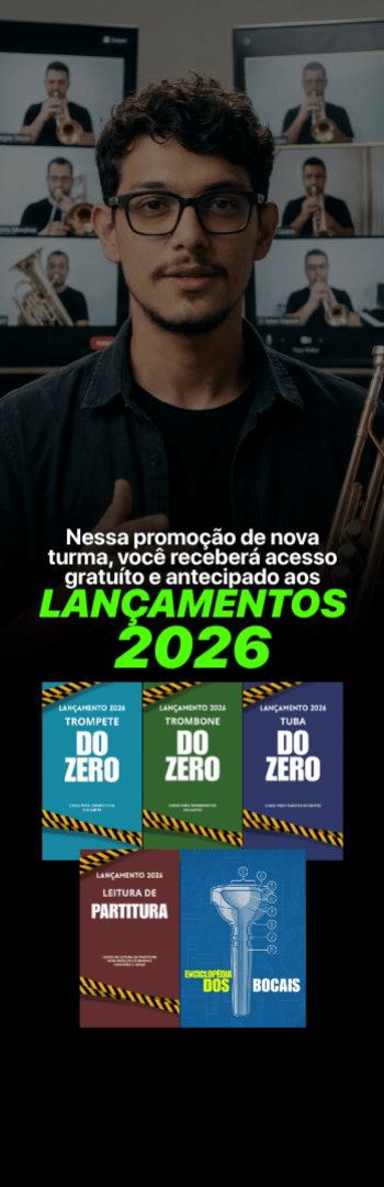 Banner lateral do produto. Segue a descrição do conteúdo: O Fórmula da Embocadura Resistente (FER) é um curso online completo, desenvolvido especialmente para trompetistas e trombonistas que desejam conquistar uma embocadura forte, resistente e duradoura.