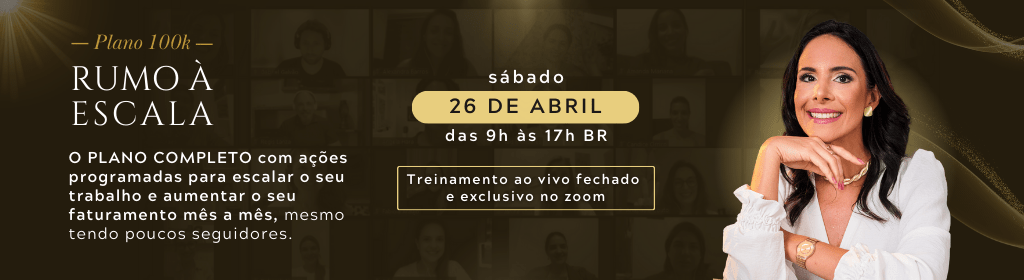 Banner superior do produto. Segue a descrição do conteúdo: O PLANO COMPLETO com ações programadas para escalar o seu trabalho e aumentar o seu faturamento mês a mês mesmo tendo poucos seguidores.