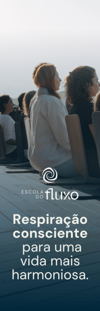 Banner lateral do produto. Segue a descrição do conteúdo: O curso de consciência respiratória que ensina técnicas de respiração, consciência corporal e atenção plena para uma vida com menos resistência e mais fluidez. Permita-se embarcar em uma jornada de autodescoberta, fazendo de cada respiração um passo em direção a uma existência mais plena e harmoniosa.