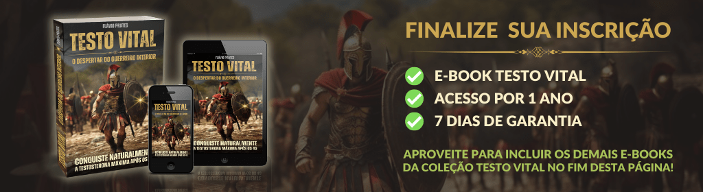 Banner superior do produto. Segue a descrição do conteúdo: O TESTO VITAL - O Despertar do Guerreiro Interior é sua oportunidade de trilhar o caminho natural, saudável e eficaz para aumentar seus níveis de testosterona naturalmente. Aqui você encontrará todas as ferramentas necessárias, sem recorrer a hormônios sintéticos que só trazem problemas a longo prazo.
