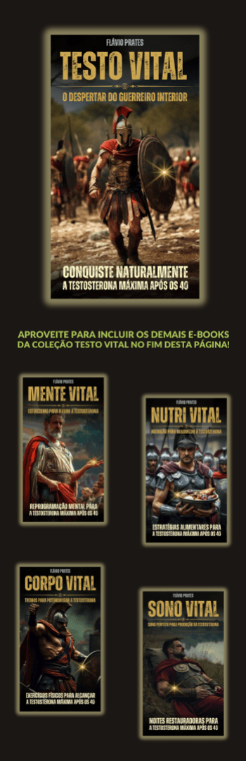 Banner lateral do produto. Segue a descrição do conteúdo: O TESTO VITAL - O Despertar do Guerreiro Interior é sua oportunidade de trilhar o caminho natural, saudável e eficaz para aumentar seus níveis de testosterona naturalmente. Aqui você encontrará todas as ferramentas necessárias, sem recorrer a hormônios sintéticos que só trazem problemas a longo prazo.