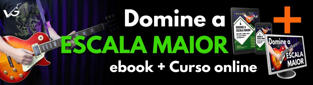 Banner superior do produto. Segue a descrição do conteúdo: Com esta apostila você vai dominar a Escala Maior e ser capaz de solar e improvisar em qualquer tonalidade, em todo o braço da guitarra, em qualquer direção (vertical, horizontal, diagonal), saltando cordas e aplicando diversas técnicas como Slide, Palhetada Alternada, Economy Picking, Ligaduras, Tapping...