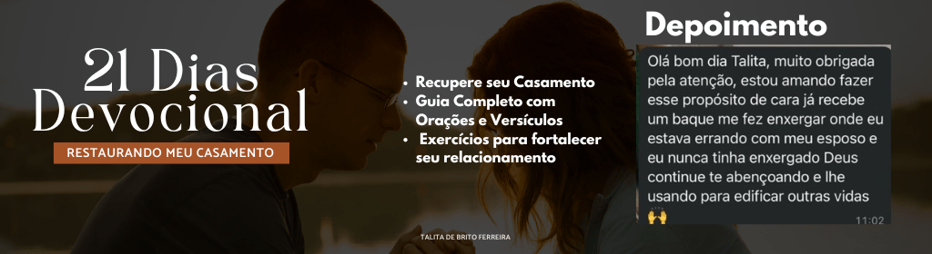 Chegou o momento de um novo começo. Deus está chamando você para uma transformação profunda, não apenas no seu casamento, mas em sua vida inteira. Talvez você tenha se sentido perdida, sobrecarregada e sem saber por onde começar. Mas quero te convidar a dar um passo decisivo, cheio de fé e confiança, para abrir seu coração para a transformação que Deus tem reservado para você. Ele deseja te restaurar, curar e te levar a um novo nível de vida, de relacionamento e de paz interior. A mudança começa agora e ela começa com você.
